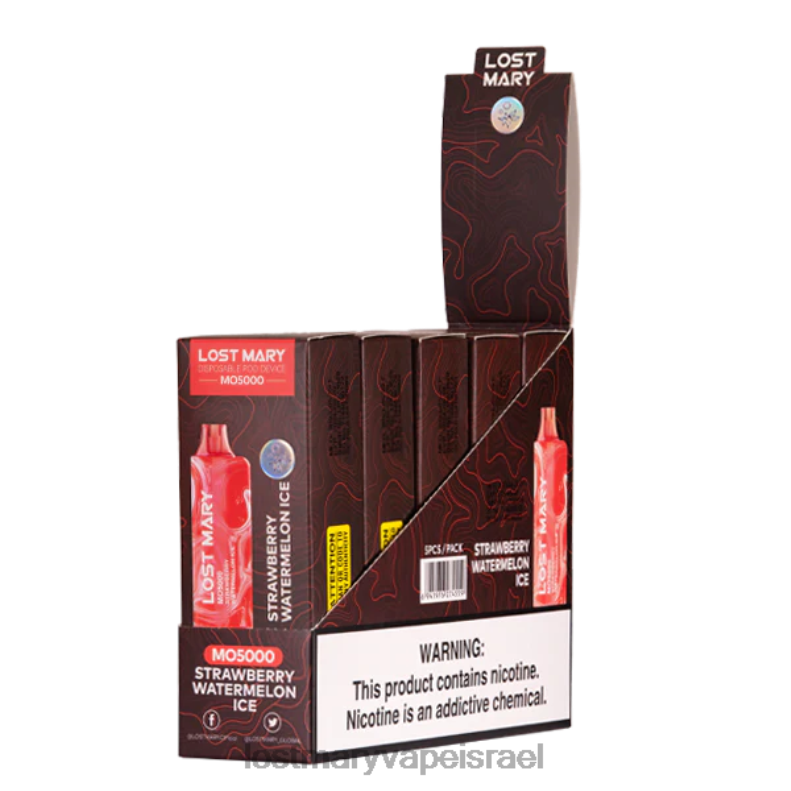 התות אבטיח קרח אבוד mary mo5000 vape ממולא מראש בתערובת מיץ תות ואבטיח מסוכרים המסתיימת עם מנטה מקררת בנשיפה.