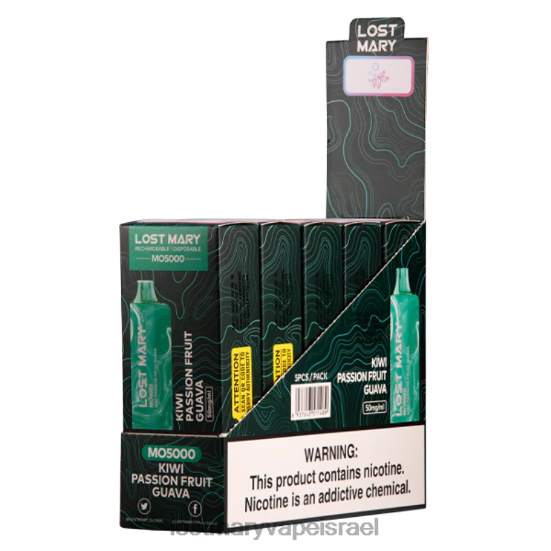 ה-kiwi fuse lost mary mo5000 vape נטען (שנודע בעבר בשם גויאבה פסיפלורה קיווי) משתמש בתערובת טרופית של טעמי קיווי, פסיפלורה וגויאבה.